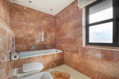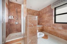 De badkamer werd uitgerust met een ligbad, douche, toilet, bidet en een dubbele lavabo.
