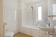 Op de eerste verdieping bevinden zich drie slaapkamers en een badkamer voorzien van een ligbad, wastafel en toilet. De indeling maakt de woning ideaal voor gezinnen of thuiswerkers.
