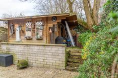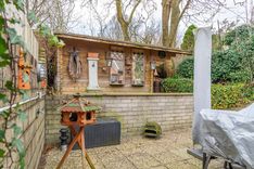 BUITENRUIMTE: Fraai aangelegde achtertuin met een praktisch tuinhuis, perfect voor ontspanning of opslag.