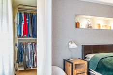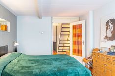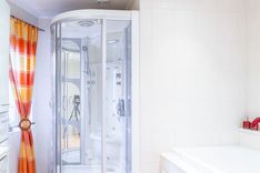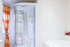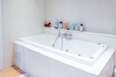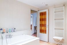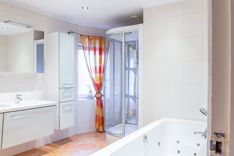 Eerste verdieping: Royale badkamer met jacuzzi, een werkkamer en een ruime slaapkamer.
